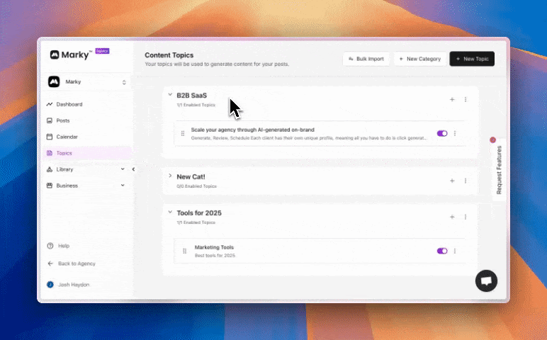 Sort your topics by content pillars — like “Customer Stories” or “Behind the Scenes” — and stay organized as your strategy grows.